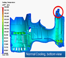 以下的案例將就傳統水路和異型水路設計的冷卻結果作比較。下圖為幾何複雜且厚度變化極大的產品模型。使用異型水路設計將可大幅降低冷卻時間逾33% (10秒)。