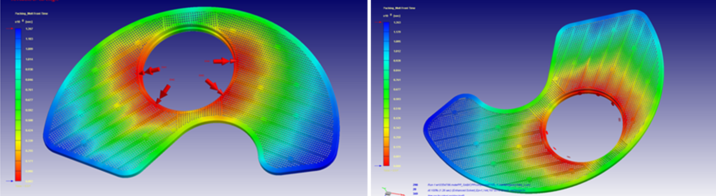 为了决定最佳的浇口数量和位置,必须执行多项分析来了解最佳充填位置,以将成型后的翘曲问题降至最低。流动分析则分别比较4个和7个浇口的设计。
