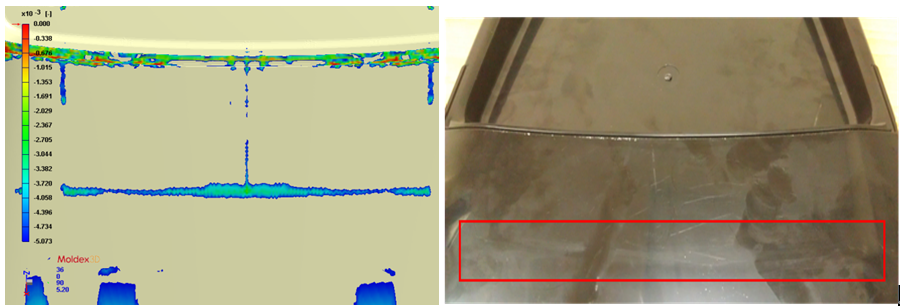 透过Moldex3D模流分析模拟,在尚未开模前即发现该产品背部肋条区域因肉厚较薄,有流动迟滞的现象,将容易产生较大的射出压力,进而导致局部短射。在实际开模射出后,也印证该区域确实会产生局部短射的现象。
