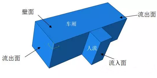 以容器内的流体运动来模拟车厢与人流攒动,假设车厢长6m,宽2m,高2m,人流高2m,宽1m,长1m,建立几何模型如图2所示,人流涌进的面为流入面,车厢两端的2个面为流出面,其他的10个面均为壁面。