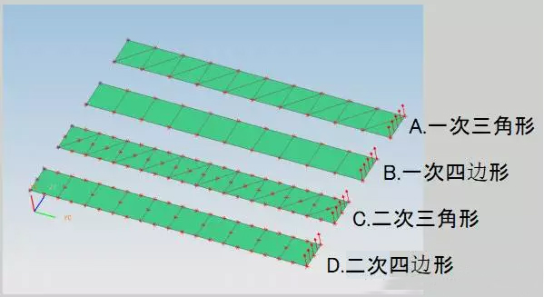 可以看到,求解结果及精度存在着很大的影响。这与单元的形状和阶次有很大的关系,二次四边形单元得到的求解结果最精确,一次三角形最差。 然后再对不同的Shell单元施加弯曲载荷,如图: