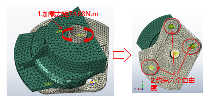 对限位块结构进行强度分析是机械转轴结构设计中所需关心的重要问题,通过CAE仿真基板和转轴结构在特定基板力矩下的受力情况,分析基板和转轴结构是否会发生断裂破坏,为进一步改进结构设计提供了理论依据。 案例概述 设定作用于基板力矩{62.4N.m*1.2(安全系数)=74.88N.m},分析左右限位两种工况下,基板与转轴的强度。通过分析发现,产品在特定情况下存在断裂危险,需要对产品进行优化和改善。 使用软件: Hypermesh,abaqus/standard CAE模型及材料 材料及参数: