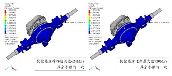 考虑疲劳强度缩减系数等因素,该冲焊桥壳的疲劳寿命分析结果为104万次至135万次,满足设计要求不小于80万次。其中104万次的分析结果抗拉强度取值624MPa(抽样检测值),135万次的分析结果抗拉强度取值720MPa(理想最大值),其余参数均一致。疲劳寿命云图如图10所示: