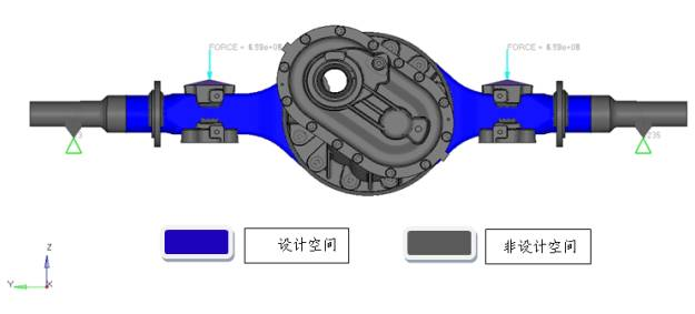 驱动桥是重卡上的重要总成之一,其桥壳总成按照生产工艺的不同,主要分为铸造桥壳、锻造桥壳、无缝钢管冷涨成形桥壳和冲压焊接桥壳等。其中板材冲压焊接桥壳具有重量轻、强度高、工艺性好、成本低等优点,在国内外重卡公路牵引车、载货车及轻量化自卸车等车型上广泛应用。 本文主要介绍使用HyperWorks仿真平台在冲焊桥壳总成开发设计过程中的应用。 2、基于HyperWorks的冲焊桥壳设计 该桥壳本体为Q460C材料冲焊件,密度为7.85×10-9t/mm3,取杨氏弹性模量为206000MPa,泊松比为0.280,屈服强度为460MPa,抗拉强度为624MPa(桥壳本体材料试样检测值),疲劳强度系数取965MPa,疲劳强度指数取-0.0731。 采用HyperWorks11.0进行冲焊桥壳总成分析,分析流程为使用OptiStruct对桥壳本体进行尺寸优化、使用HyperForm对桥壳半壳进行RADIOSSOneStep的冲压成形可行性分析、使用OptiStruct对桥壳总成做静刚度强度分析、最后使用RADIOSS对桥壳总成进行疲劳寿命分析。 (1)基于OptiStruct的尺寸优化分析 尺寸优化是最经典的优化技术,一般也叫参数优化技术(改变模型参数值,网格模型保持不变),可以对有限元模型的各种参数,如板件厚度、杆梁截面尺寸、材料特性、弹性元件刚度等进行优化。根据设计阶段的不同,可分为用于详细设计的尺寸优化技术和用于概念设计的自由尺寸优化两种类型。 该桥壳总成使用详细设计的尺寸优化,分析模型划分为蓝色设计空间和灰色非设计空间,其尺寸优化有限元分析模型如图1所示: 桥壳总成尺寸优化问题描述如下: 目标函数:桥壳本体板厚最小化; 约束函数:桥壳本体的疲劳寿命值不低于80万次; 设计变量:蓝色区域的单元厚度(初始值16mm,下限10mm,上限20mm); 定义离散设计变量起始值为10.0,终止值为20.0,变量每次增加0.2;