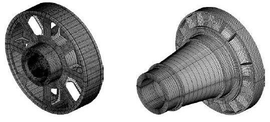 目前国内市场上已经出现了2.5MW、3.0MW和5.0MW等大型风电机组。随着风电机组功率等级加大,其内部各零部件所承受的载荷明显增大,风电机组发电机要在各种载荷工况下安全运行,其重要部件必须满足强度要求。发电机作为风电机组的重要部件,其强度对整机的可靠性至关重要。同时,风电机组设计须满足20年的使用寿命,这使得发电机关键零部件的强度设计尤为重要。一方面,发电机部件设计需要满足极限强度要求,另一方面,还需要综合考虑零部件疲劳强度对发电机使用寿命的影响。 在此背景下,以有限元分析、动态设计和抗疲劳设计等为主要内容的现代设计方法在风电机组结构设计中日益得到重视。目前,国内学者在强度研究方面较为典型的研究包括:何玉林等运用风电机组空气动力学、结构动力学、强度分析等理论和现代设计方法,利用有限元分析软件对主机架结构进行了静强度和疲劳寿命分析;杜静等基于风电机组主轴有限元模型,对兆瓦级风电机组主轴疲劳损伤进行了研究,提出了将雨流循环计数法与Palmgren-Miner线性累积损伤理论相结合的主轴疲劳损伤计算方法;王平等应用有限元软件对风电机组的轮毂进行了极限强度和疲劳强度分析,模拟了疲劳载荷和材料的S-N曲线;杨兆忠等以轮毂为例,从极限强度和疲劳寿命两个方面,结合有限元软件对铸件强度进行了校核;姚兴佳等以HyperWorks作为分析平台对轮毂结构进行了优化;沃晓临等采用有限元软件对兆瓦级风电机组轮毂与主轴的连接螺栓做了强度分析,对连接螺栓本身,在极限载荷与疲劳载荷下进行了仿真计算;李超等采用有限元商业软件为工具,对某兆瓦级风电机组机舱罩的极限强度进行了计算分析。 上述研究集中在风电机组主机架、主轴、轮毂和螺栓等零部件,对于直驱式风电机组发电机部件强度没有做特定分析。发电机部件作为风电机组的重要组成部分,在大功率化趋势下其部件强度研究对整机安全性和可靠性不可或缺。本文建立某2.0MW直驱式发电机的有限元模型,将综合应用有限元软件和疲劳分析软件分析校核电机转轴、定轴及转子支架的极限强度和疲劳强度。根据GL2010认证规范,推导了电机转轴、定轴及转子支架的S-N曲线表达式。 2、发电机主轴极限强度分析 (1)有限元模型建立 某2.0MW直驱发电机由转轴、定轴及转子支架等部分组成。利用三维建模软件建立几何模型,在建模过程中,需对强度影响很小的特征,如小的倒角、凸台等进行简化。其后将几何模型导入专业的有限元前处理软件进行网格划分,以建立分析所需的有限元模型。根据直驱发电机的结构特点,基于HyperMesh软件对发电机的主要结构采用实体单元离散。各部分均尽可能采用网格协调的方法连接。最终的有限元模型共包含391246个节点,323460个单元,总体与零部件网格模型如图1所示。在模拟回转支承的端面全约束,以消除整个模型的刚体位移。根据GL2010认证规范设定工况和参数,由GHBladed自动输出极限工况和疲劳工况载荷数据,其中共包含16个极限工况和89个疲劳工况。