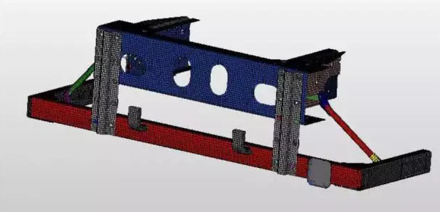 (2)GB26511法规要求 GB26511法规适用于安装在N2和N3类车辆上的下部防护装置,本法规的目的是对M1或N1类车辆提供在发生前部碰撞时的车辆前下部的有效保护。GB26511法规规定了商用车前下防护装置的设计要求和碰撞试验方法,主要对于卡车前下防护装置进行以下三个点进行碰撞测试。具体碰撞试验要求如下: 第一、各P1点与切向前轴上的轮胎的最外侧点的纵向平面的距离最大为200mm,但不包括靠近地面的轮胎的膨胀;各P2点与相互距离为700-1200mm(包括)的车辆的中间纵向平面相对称。P3点位于车辆的垂直纵向中间平面上。如果与前下部防护相关的车辆的结构和部件位于完全与其纵向中间平面对称的位置,则在各P1和P2点上的试验应在一边上进行。 第二、与车辆或要安装的车型的最大重量的50%相等但不超过80×103N的水平力应连续地施加在两个P1点上;与车辆或要安装的车型的最大重量的100%相等但不超过160×103N的水平力应连续地施加在两个P2点上。如果装置不连续以及在两个P2点之间的截面面积过小,则试验应继续在P3点上施加与P1点上同样的水平力。试验时,应当尽可能快地施加试验力,并且装置或车辆应承受至少0.2秒的下述规定的力。 (3)前下防护碰撞有限元模型建立 按照碰撞分析网格建模要求,严格控制网格质量,建立的有限元分析模型中,车架纵梁,车架横梁,圆管梁,保险杠和前防护等采用壳单元模拟,网格大小平均值为10mm,螺栓连接采用RBODY单元进行模拟。保险杠支架的材料牌号为Q235,其余结构材料为610L,有限元模型如下所示:
