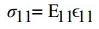 其中和分别为节点a和b的位移(displacement),L为单元1(element1)的长度。假设材料为弹性材料,杨氏模量为E(Young‘sModulus),则由材料力学可得单元1的应力: