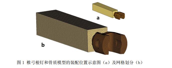 有限元模型的建立 椎弓根钉三维模型依据某型产品的实测尺寸建立,外径 6mm,螺纹有效长度 35mm。椎弓根处骨质模型的尺寸参考健康男性 CT 扫描图像中显示的腰椎椎弓根选取,采用 10mm×10mm×40mm 的长方体骨组织模型。