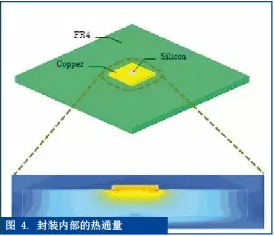 2、更贴近真实PCB电路板应用的案例分析 真实世界中的案例,(例如安装在PCB电路板上的封装),如图4所示,热扩散不仅发生在垂直方向上,还发生在水平方向上。