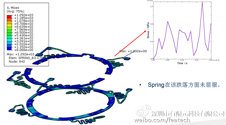 结论: Spring-1和Spring-2在裸机跌落中已发生屈服并产生塑性变形,不符合设计要求; 从整体上看,Spring-1优于Spring-2;因此在Spring1基础上进行结构优化; 结构优化后的Spring3,在各个方向跌落(包括带手机)的最大应力均低于材料的屈服应力,未发生塑性变形;Spring3结构满足设计要求,建议采用该优化设计。 使用软件 Hypermesh, Abaqus/Explicit