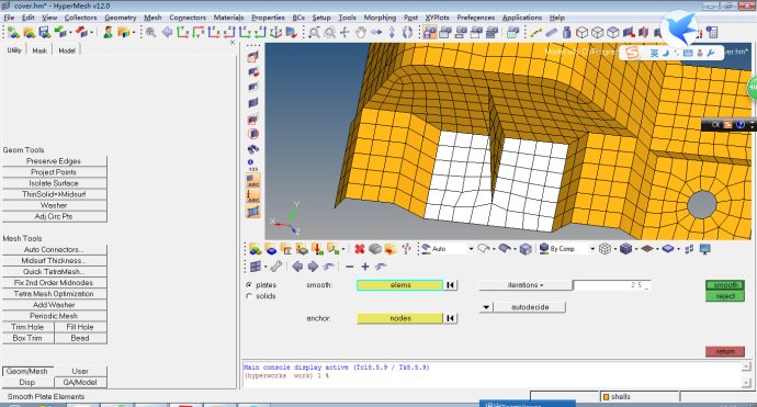 本案例学习的是hypermesh对单元的连接关系检查/单元的创建、编辑、分割、合并、细化等/washer的创建(Washer一般用于给孔附近的网格加密)/单元的法向检查与调整。。。。单元相关的功能操作 1、首先,对容差小于在单元尺寸1/10的地方进行合并处理。edges——elements——