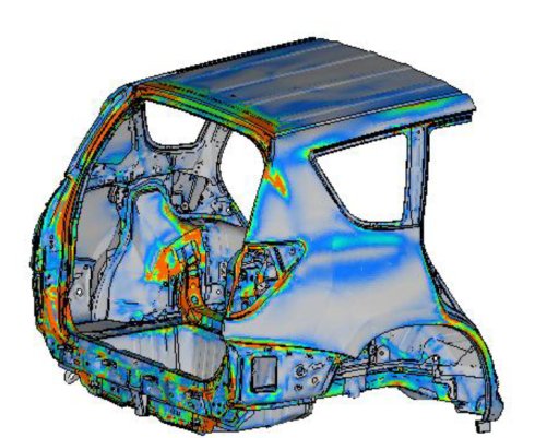 CAE仿真结果为了与试验达到一致,必须组织专门的对标工作,对标CAE分析与试验在边界条件、加载方式、白车身状态和测量点等的一致性,保证设计数据阶段的CAE分析结果能够准确反映白车身数据的刚度情况,减少后期的整改时间。刚度CAE计算在理论上已经非常成熟,在这次项目中引入白车身刚度分析后,在样车试验阶段没有再出现白车身刚度整改的情况,车身是整车的基础,良好的基础是良好整车性能的必要条件。