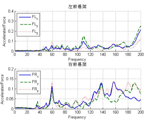 发动机和悬架在车身上的连接点的动刚度是影响车身NVH性能的重要指标,进行动刚度分析可以了解对车身输入激励的位置刚度情况。如果刚度不足,那么对车身形成的激励信号通过连接点后将会被放大,进而造成车身响应较大,所以有必要对底盘、动力总成与车身之间的连接点进行动刚度分析。频率响应分析可以求出结构在多种频率下的位移、速度和加速度的响应,进而得到相应的频率响应曲线。根据响应的特征又可分为:位移、速度和加速度频率响应函数三种,在车身CAE分析中,动刚度分析常采用速度导纳进行评价。